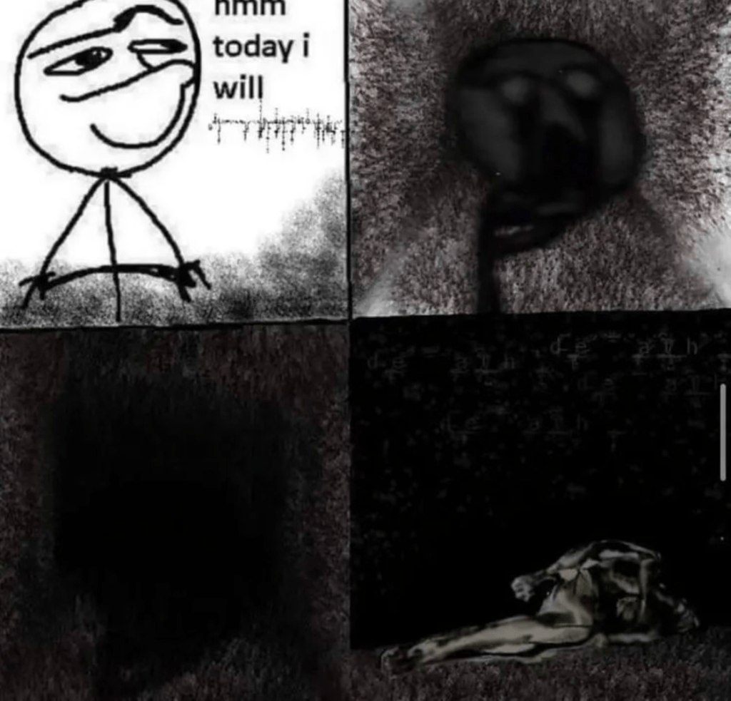 This post bastardizes early-2000s era Trollface-esque memes and distorts them into anguished representations of the mental toils of the modern age. Its panels quickly devolve into blackened, dramatic depictions of a rapid plunge into madness. What I’m interpreting from this Loss-resembling shitpost is a loss of purpose. There’s no point in doing anything anymore; there’s nothing you, as an average person, can do to stop us from reaching humanity’s point of no return. Sure, the little things like recycling or being kind to others can help a bit, but we have no more real power in society. The only other option is to succumb to madness like our 2-D protagonist has.