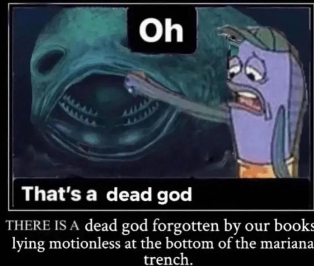 I’m a bit disturbed. Behind the irony of one of the background characters from Spongebob, a cheery kids’ show, coming to terms with the lack of a God’s omnipotence and the existent horrors beyond human (or anthropomorphic sea creatures, in this case) lies something deeper. There’s something relatable, in a sense, to the fish’s tired nonchalance towards the festering corpse of a long forgotten God. We’re constantly barraged by tragedy, becoming quickly desensitized to horrific news stories about mass shootings or devastating natural disasters— this post is an exaggerated, satirical extension of this numbness. I honestly wouldn’t be surprised if we did find some Eldritch monstrosity at the bottom of the ocean at this point, either.